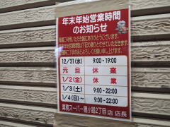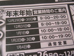 前回同様、12/31=18時まで、1/1-1/2全店休業、1/3=10時から