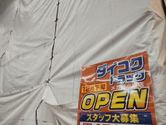 ドラッグストアが集積している狸小路5丁目に出店予定となっている、ダイコクドラッグメガ狸小路店。サツドラ真横の出店予定地では、これまで白いシートで覆われているだけの状態だったが、このほど、そのシート外側に、ダイコクドラッグのスタッフ募集案内が掲示された。12月下旬OPENとの文字も確認できる。年末には、狸小路5丁目にドラッグストアがまた増えることになりそう。(画像=2025.12.11、12月下旬OPENと書かれたダイコクドラッグのスタッフ募集の掲示物)