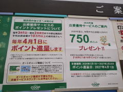 ↑2025年度の500ポイントの案内と並んで掲示されている2026年度の750ポイントの案内掲示(コープさっぽろ北12条店@12/28)