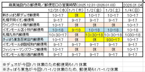 商業施設内の郵便局で、普段は土日も営業している郵便局の、年末年始における『郵便窓口』の営業予定。今回は、商業施設の休業日の増加に伴って、郵便局もそれにあわせた動きとなっている。◆デュオ郵便局は、デュオが1/1休業となったため、郵便局も1/1休業となる。◆さっぽろ東急百貨店内郵便局は、さっぽろ東急が1/1-1/2の2日間休業となったため、郵便局も1/1-1/2に休業する。◆イオン内の郵便局(平岡、苫小牧、釧路昭和、旭川西)は今回も例年通り、年末年始も休まず営業となっている。