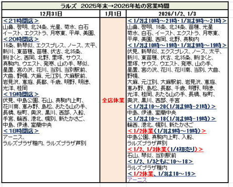 <2025年末→2026年始> 営業時間メモ(5)